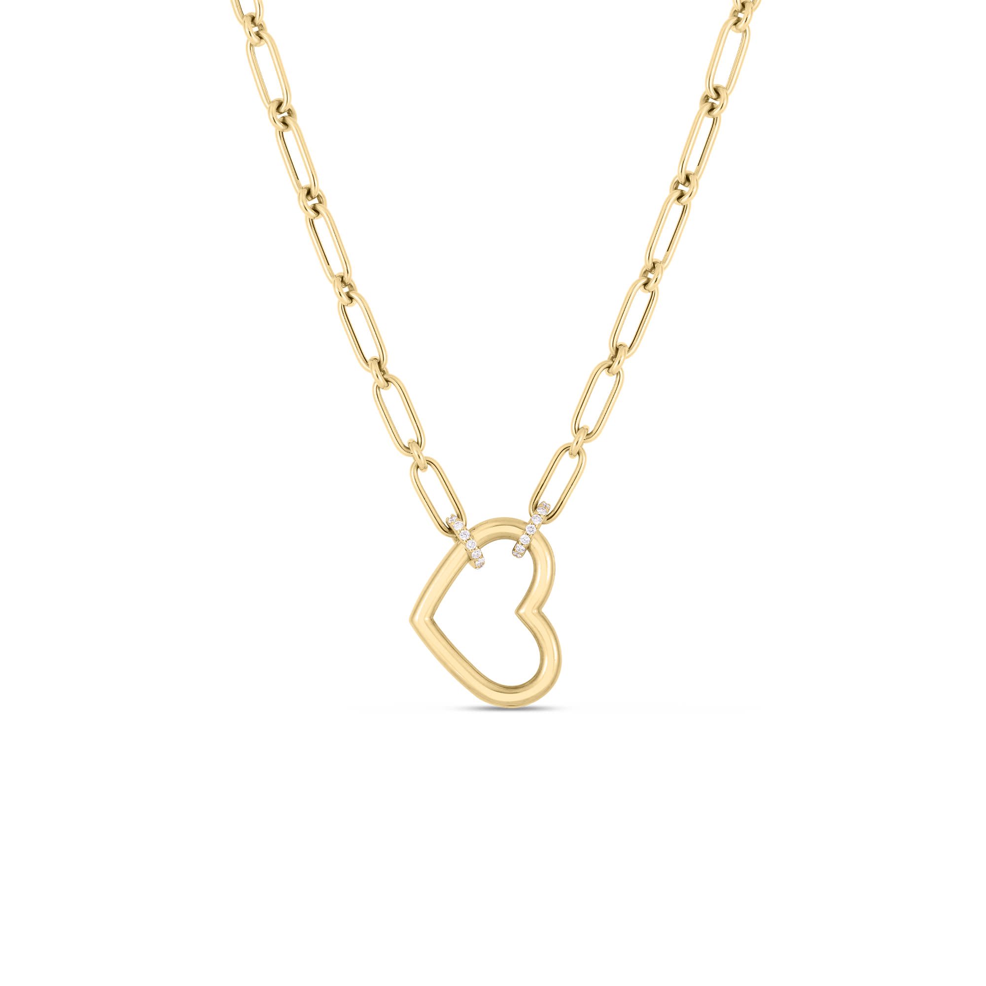 From the Cialoma Collection, this open heart dangle necklace features 0.09ct of diamonds set in 18K yellow gold. 17 inches.