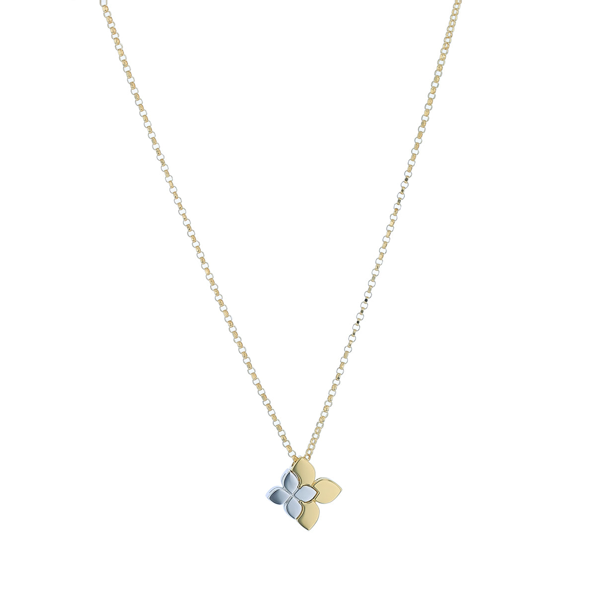 This 18K yellow and white gold necklace features 0.09ct of diamonds, suspended on a 17-inch chain.