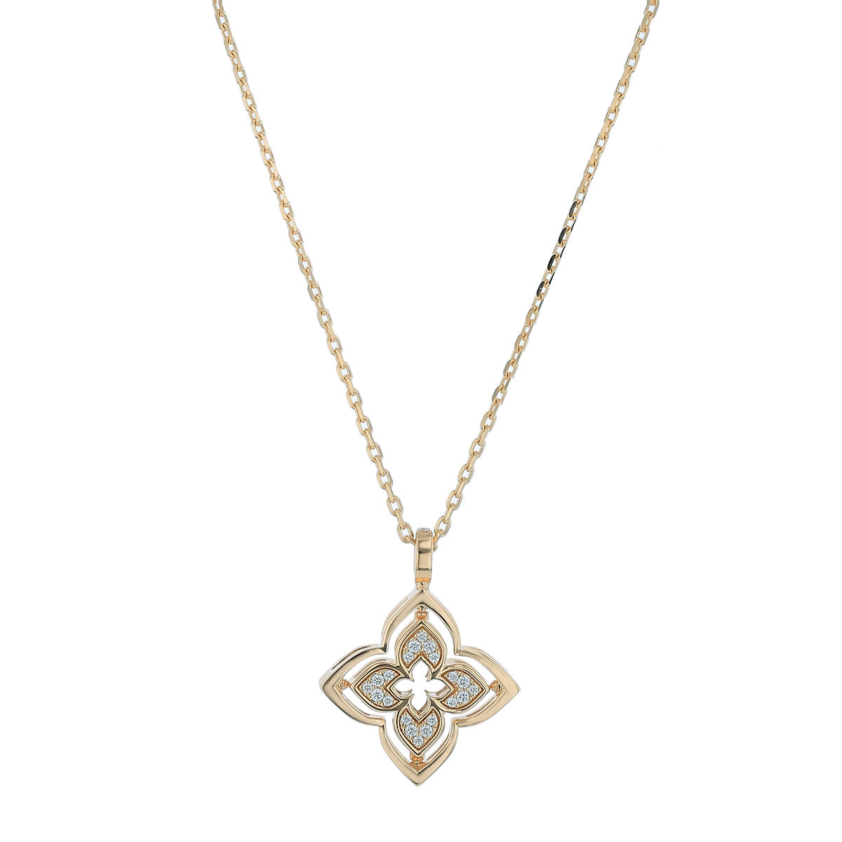 Venetian Princess Pirouette pendant showcasing 1.35ct mother of pearl and 0.15ct diamonds in a flower design, crafted in 18K rose gold on a 17" chain.