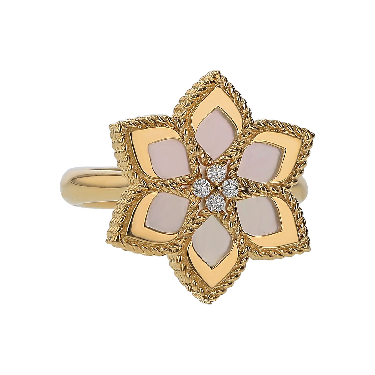 Vernazza 0.04ct of diamonds and mother of pearl set in a daisy ring crafted in 18K yellow gold, size 6.5.