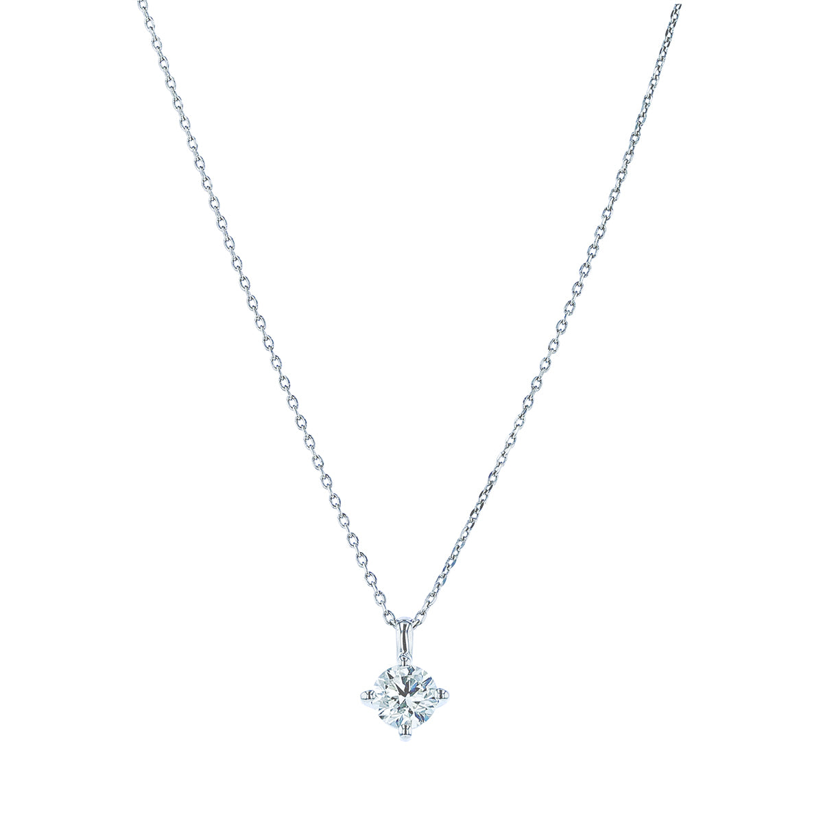 Solitaire pendant with a 0.70–0.78ct round brilliant HI/SI diamond in a 4-prong setting, crafted in 14K white gold on an adjustable 16–18 inch chain.