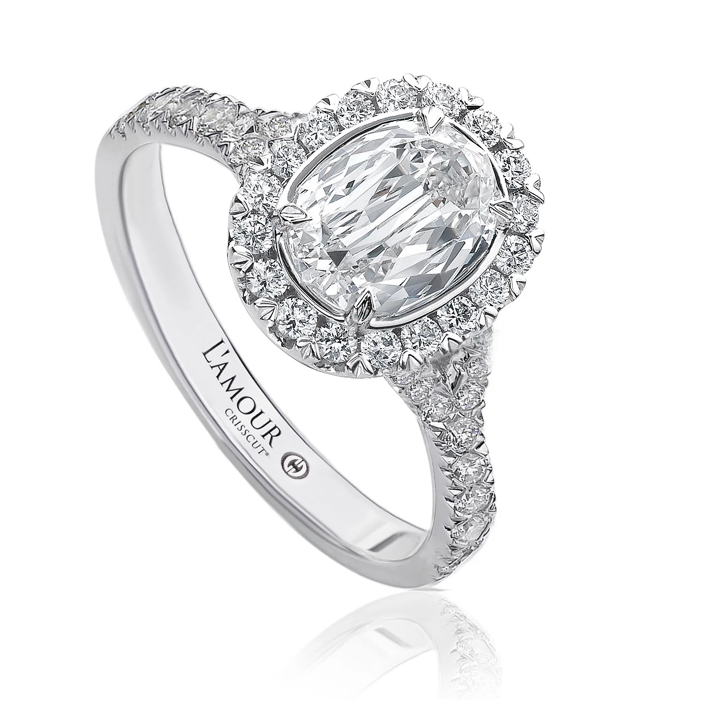 This 14K white gold halo ring features a 0.71ct Crisscut L'Amour diamond (G/SI1, GIA certified) at the center, surrounded by 0.47ct of G/SI2 diamonds, offering a refined and elegant design. Size 6.5.