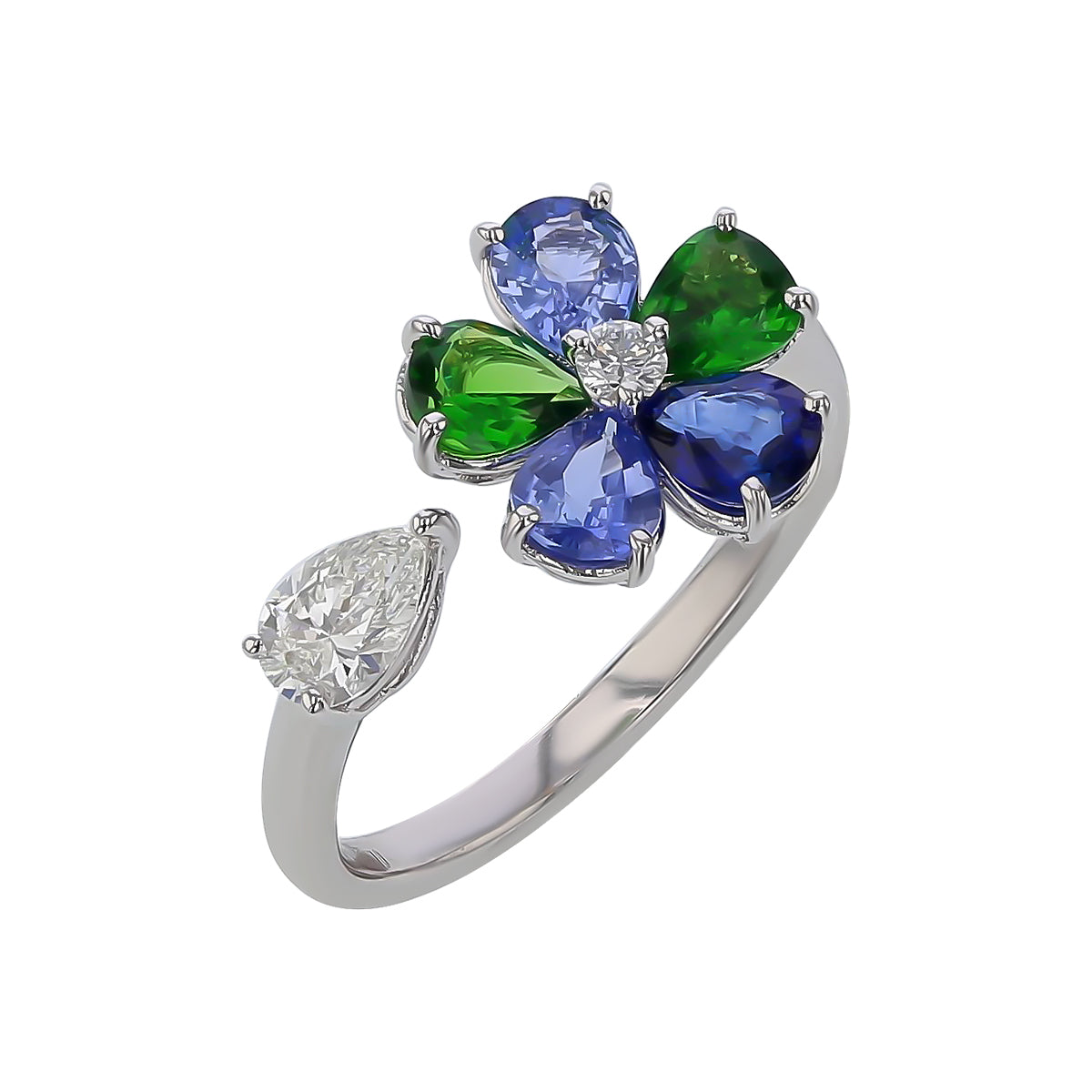 1.05ct Sapphire, 0.59ct Tsavorite and 0.35ct Diamond Flower Ring in 18k White Gold, Size 6.5