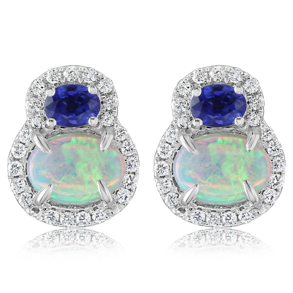 1.32ct Australian opals, 0.44ct sapphires, and 0.28ct diamonds set in halo stud earrings crafted from 18K white gold.