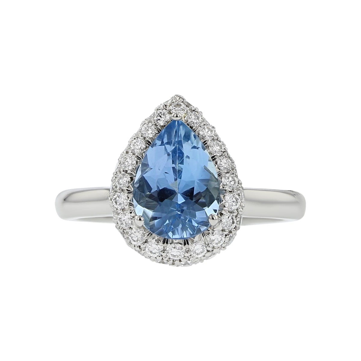 This platinum ring features a 1.44ct aquamarine center, surrounded by a 0.51ct diamond halo, creating a striking and elegant design. Size 6.25.