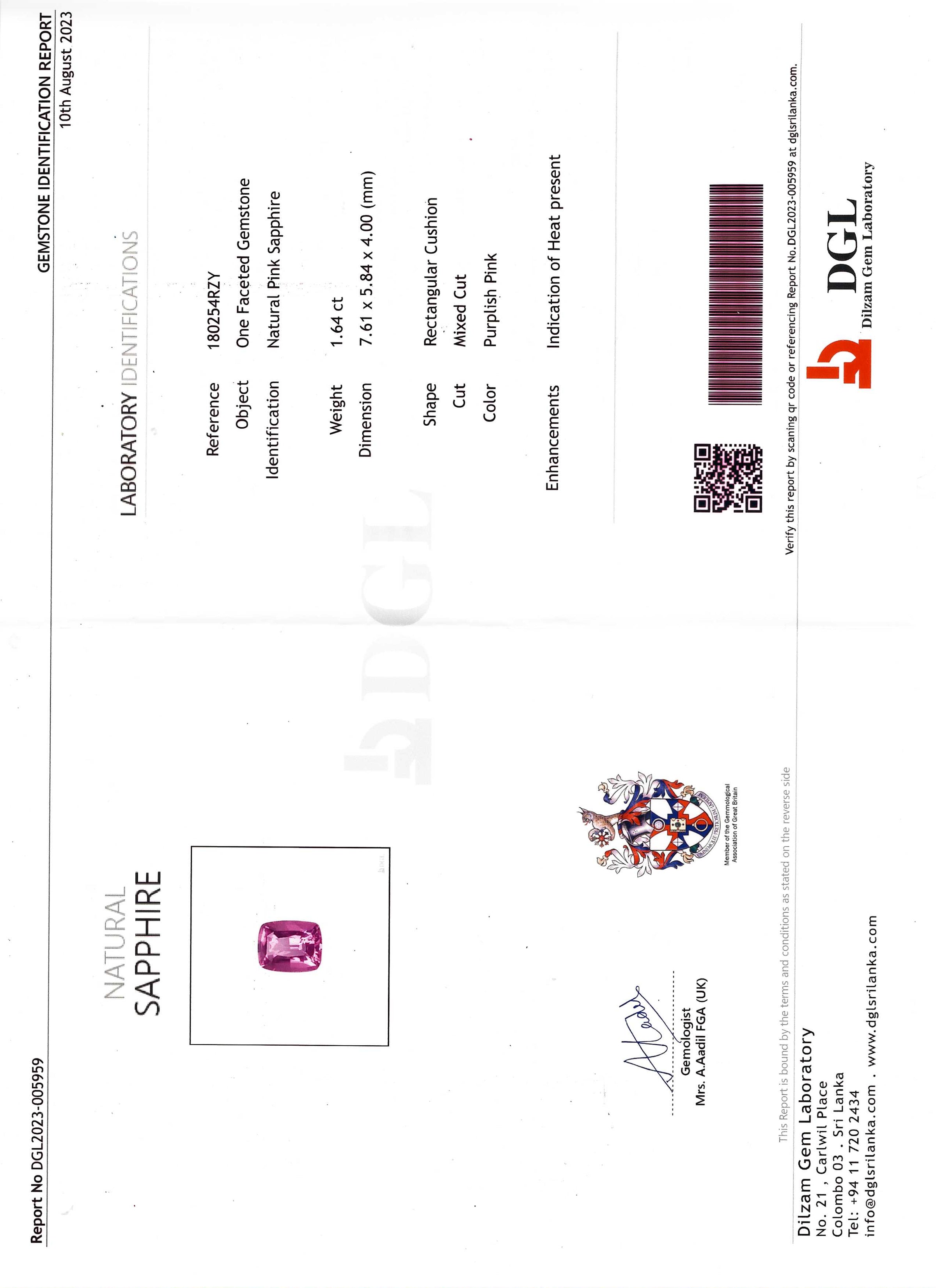 1.64ct cushion pink sapphire DGL and 0.38ct F/VS shield diamonds set in a three-stone ring crafted from platinum, size 6.