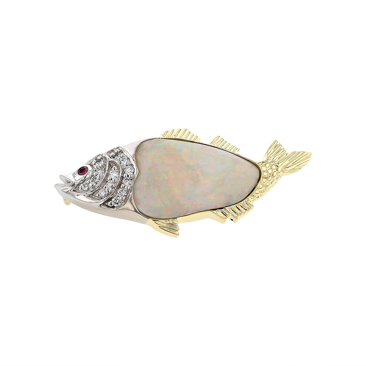 18K Yellow Gold Opal, Diamond and Ruby Fish Pin