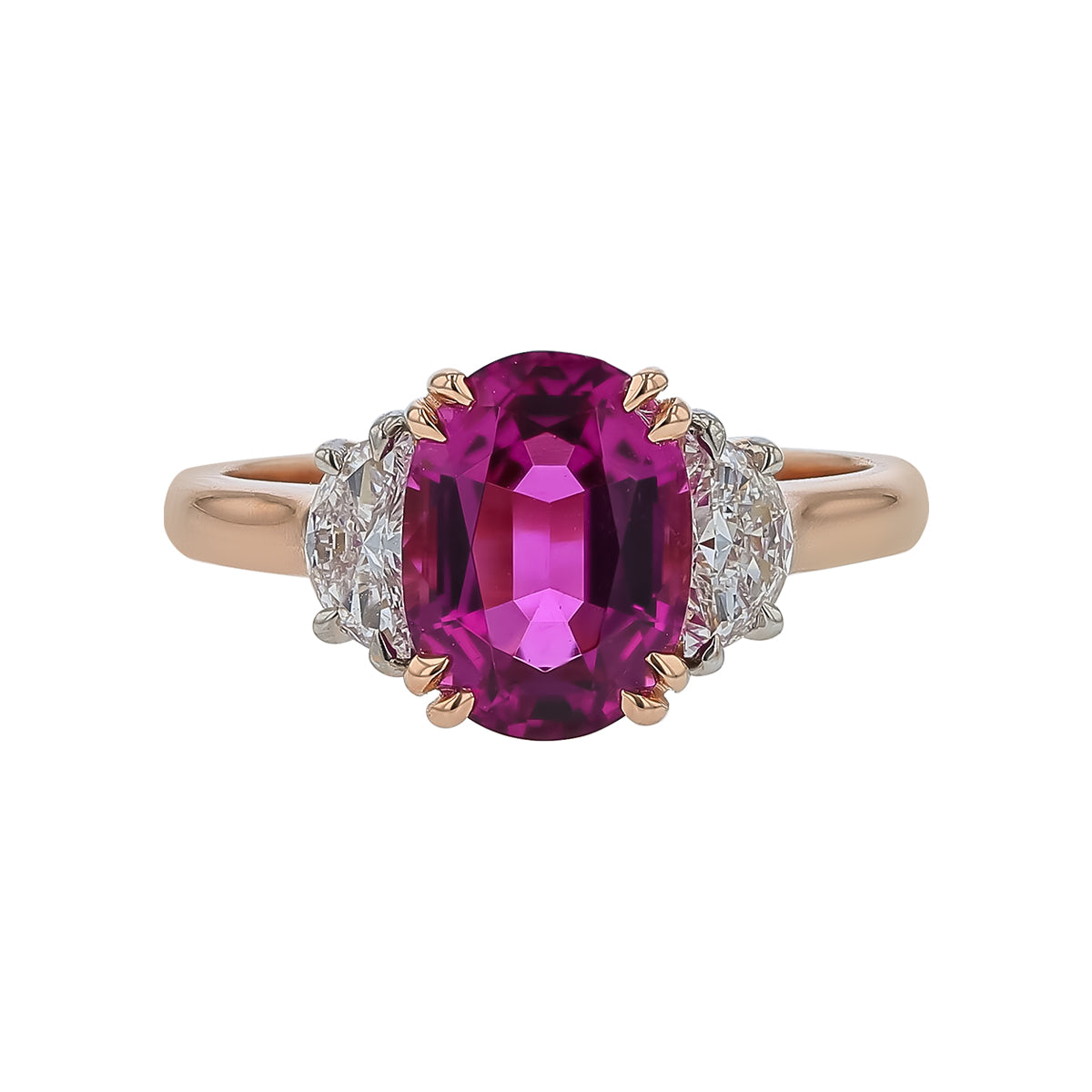 2.51ct oval Mozambique rubellite with provenance report and 0.50ct of G/VS2 diamonds in a 3-stone setting crafted from 18K rose gold. Size 6.5.