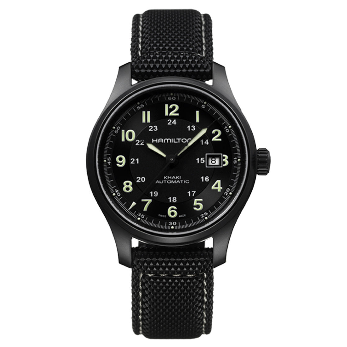 42mm Khaki Field Watch with Black Dial in Titanium, Strap