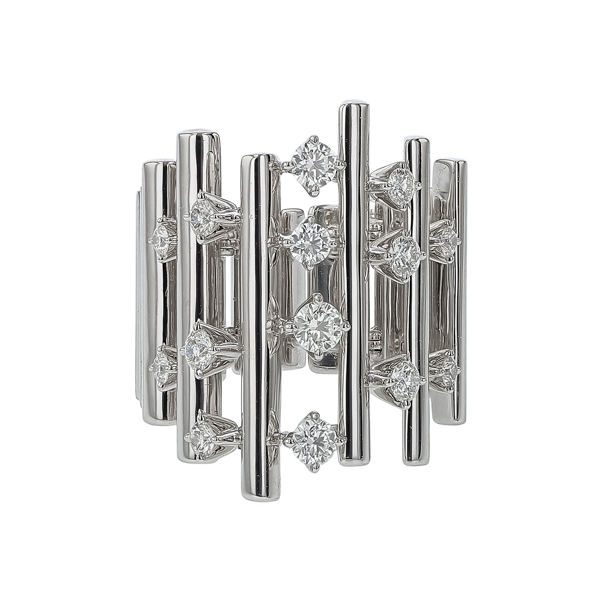 Barre multi-row ring featuring 0.70–0.80ct of GH/VS diamonds set in 18K white gold. Size 6.5.