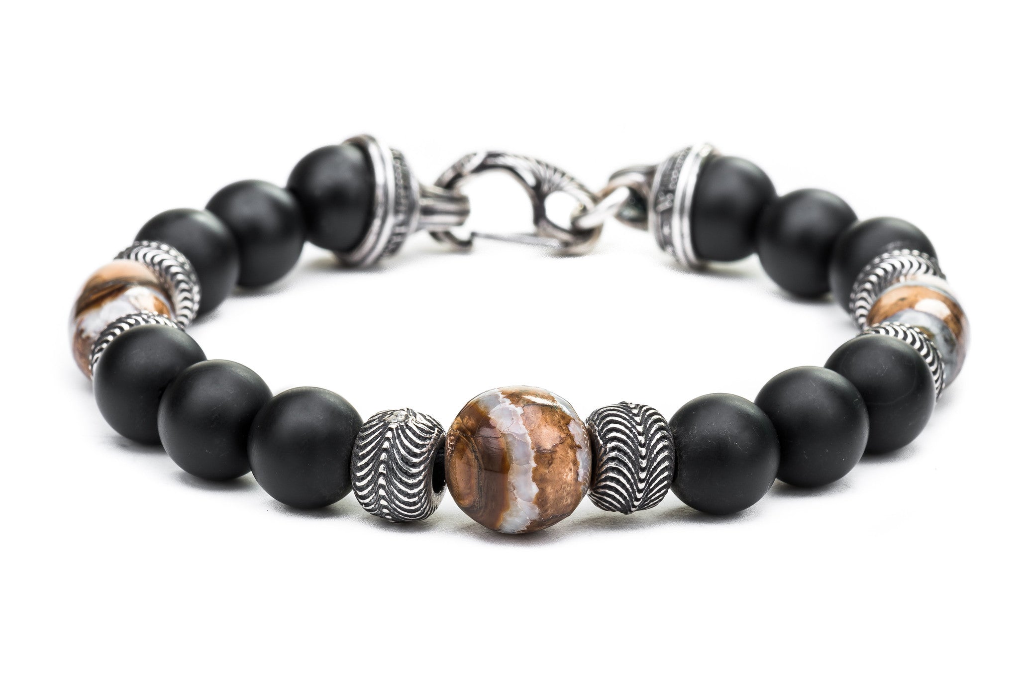 Ice Age Frosted Black Onyx and Mammoth Tooth Beaded Bracelet in Sterling Silver, Large