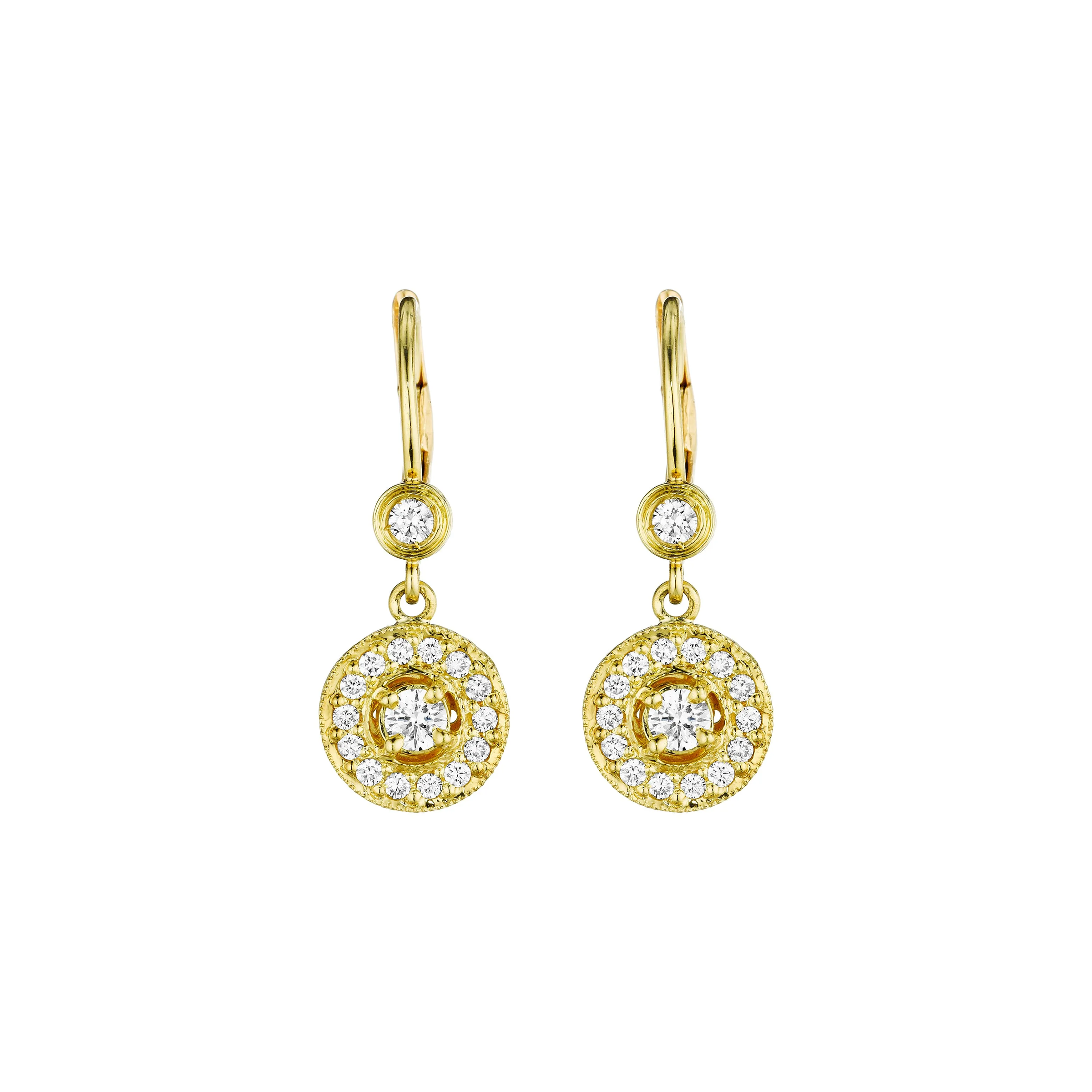 Classic round drop earrings featuring 0.62ct diamonds set in 18K yellow gold.