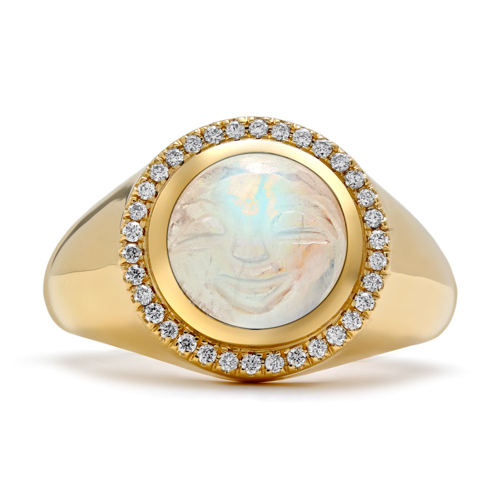 Happy Face collection 3.76ct moonstone and 0.17ct diamonds set in a signet ring crafted from 18K yellow gold, size 7.