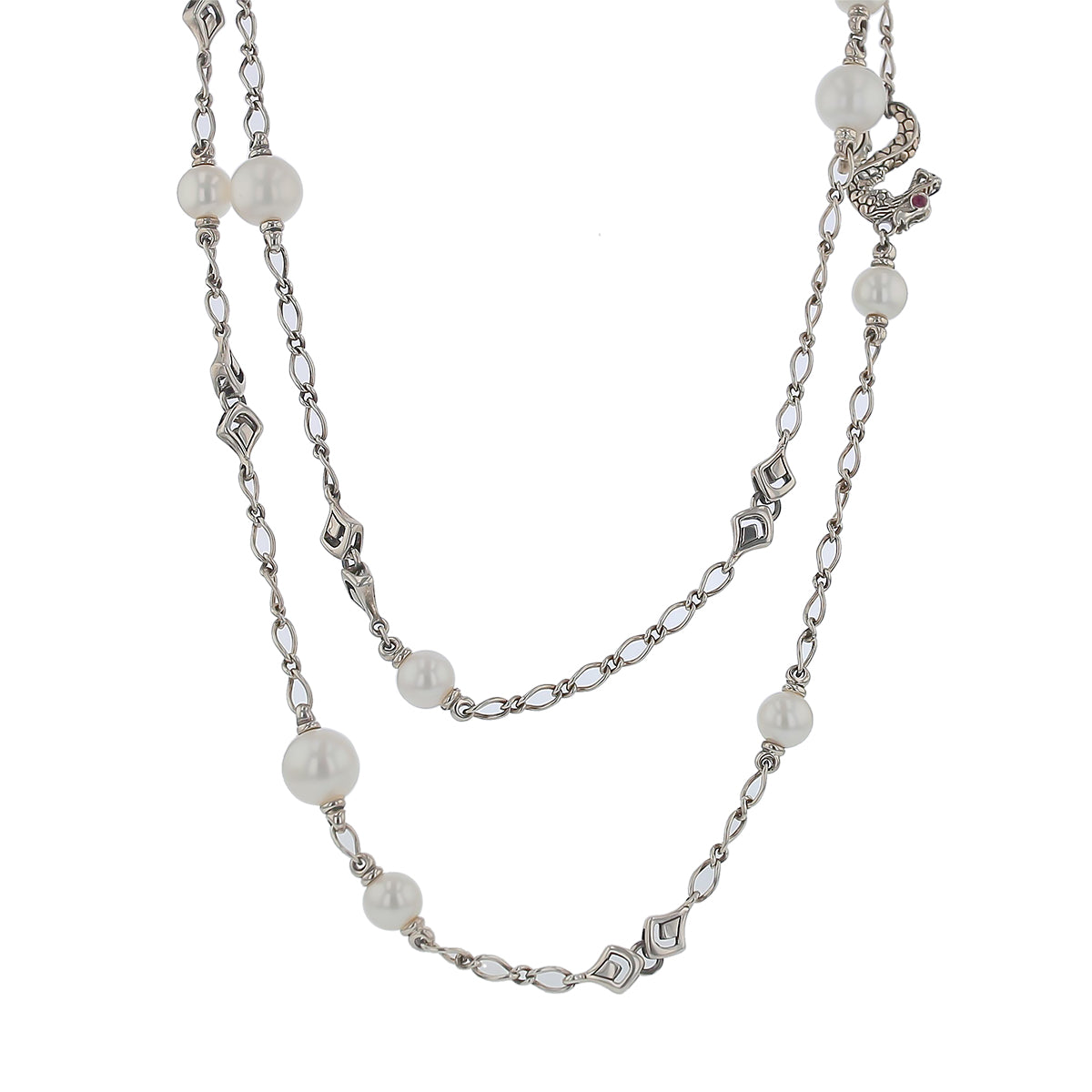 This John Hardy Naga Legends necklace features pearls set in sterling silver, with a length of 35 inches.