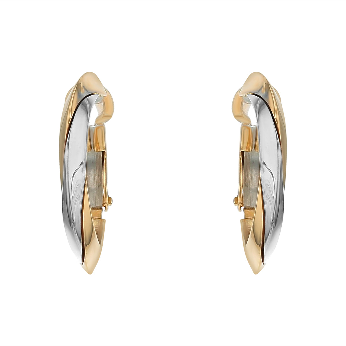 Knife edge hoop earrings crafted in 14K yellow and white gold with a polished finish and snap-back closures.
