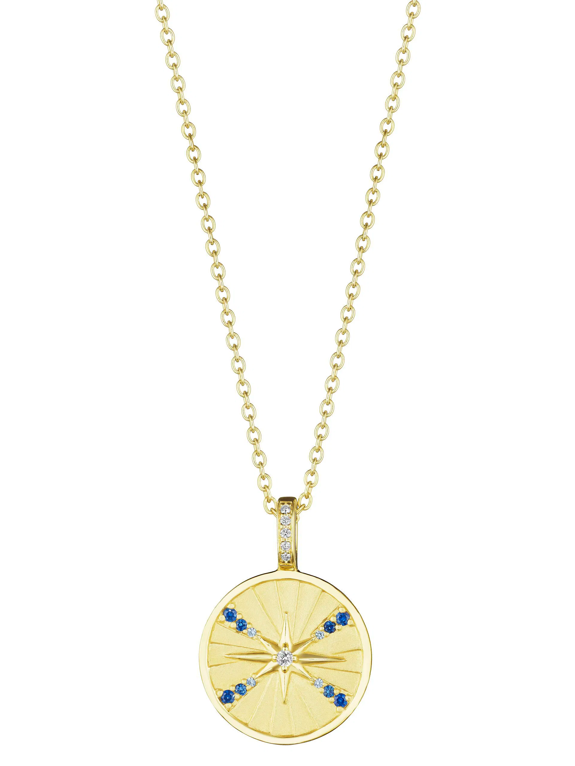 From the Ombre Collection, this compass charm features 0.45ct of diamonds and 0.14ct of sapphires set in 18K yellow gold on an 18-inch chain.
