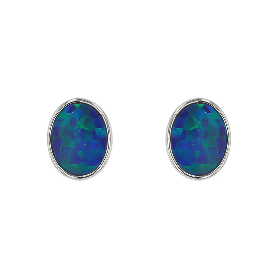 Opal Doublet Bezel Stud Earrings in 14K White Gold, 9x7mm