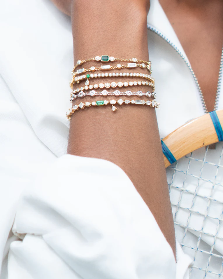 The Tennis Bracelet with 0.76ct round and pear shape diamonds and 0.50ct emeralds in a staggered design, crafted in 18K yellow gold, 7 inches.
